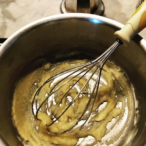 Пока тыква тушится займемся бешамелем. Масло растопить в кастрюльке на медленном огне, добавить муку и мешать до получения результата, как на фото. Затем влить теплое-теплое молоко и меланхолично помешивая наблюдать за загустением и контролировать дно кастрюльки