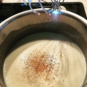 Когда бешамель будет готов потереть мускатный орех, ну или посыпать из пакетика щепотку. люблю тереть, прям ведьмой себя ощущаю и запах волшебный.