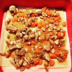 Затем начинку из тыквы и курицы, сыр натереть или кусочками сверху, чуть бешамеля и повторить. Всего 4 слоя. Закрыть фольгой. 180 градусов, 30 минут
