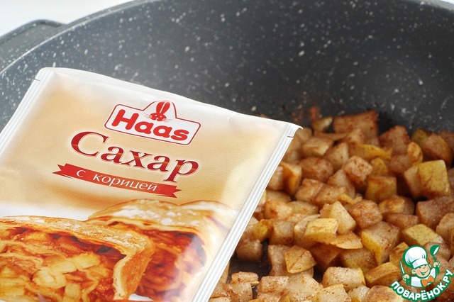 Нарезанные кусочки груши выложить на сухую сковороду, посыпать сахаром с ароматом корицы ТМ HAAS и потомить на среднем огне, до полу готовности.