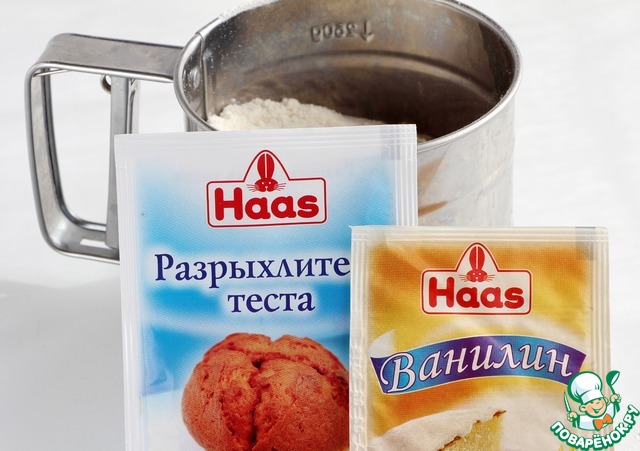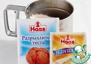 Муку смешать с разрыхлителем, просеять и добавить ванилин.
