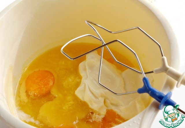 В размягченное сливочное масло добавить сахарный песок, соль, сметану, яйца и несколько капель ароматизатора. Взбить компоненты до получения однородной массы. Добавить сыпучую массу, аккуратно перемешать и взбить миксером до получения однородного теста.