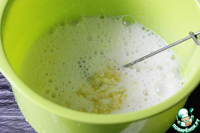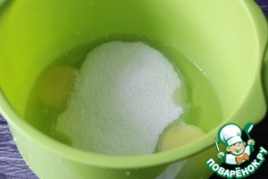 В миску вбить яйца, добавить сахар, взбить венчиком.
