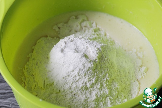 Всыпать муку, смешанную с содой и разрыхлителем.