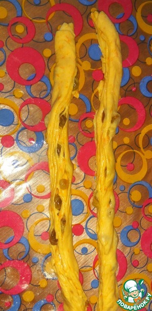 Каждую часть теста раскатываем как можно тоньше в длинный пласт. Смазываем растопленным маслом, посыпаем изюмом.