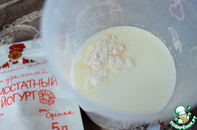 В чистую, простерилизованную банку налить 1,5 стакана молока комнатной t ( 22-24 C), всыпать 1 пакетик закваски, тщательно размешать, до полного растворения закваски, минуты 2-3, долить молоко до 1 л. метки.