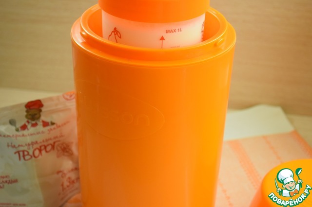 В термос-йогуртницу налить кипяток до отметок, поставить емкость с молоком и закваской, термос закрыть и убрать в теплое место на 6-10часов.
