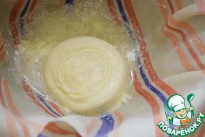 Выкладываем сгусток и сыворотку в сито, покрытое чистой марлей в несколько слоев или бязью. Подвешиваем сгусток и даем сойти лишней влаге.