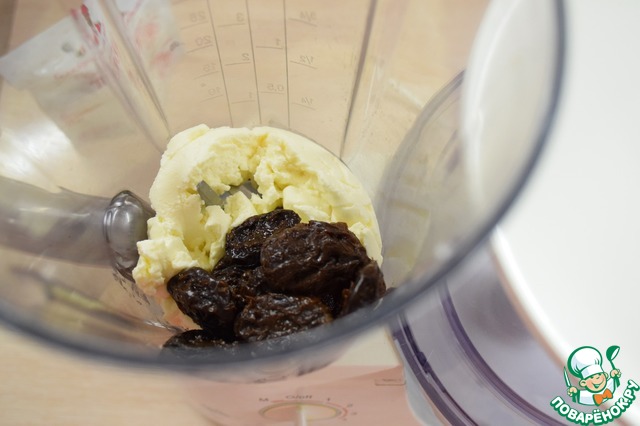 В чашу блендера или комбайна выложить охлажденный творог, добавить распаренный и обсушенный чернослив.