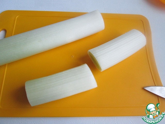 Лук-порей вымыть, отделить белую часть и нарезать её на кусочки по 5-7 см. Сколько при нарезке получится кусочков, столько понадобится и ломтиков бекона и перьев зелёного лука.