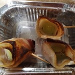 Затем достать и каждый кусочек обернуть в бекон. Закрепить рулетики деревянными шпажками или перьями зелёного лука.