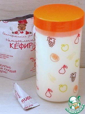 Для начала приготовим кефир. Возьмем молоко t=23 и смешаем с одним пакетиком закваски "Oursson". В термос налить кипяток до указанной отметки и установить стакан с молочной смесью. Закрыть и оставить на 8 часов. Так как нам нужен кислый кефир, то вынимаем его из термоса и оставляем еще на 6 часов при комнатной t.