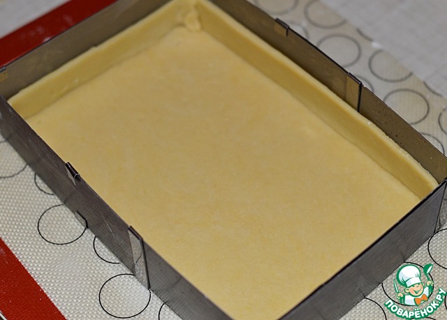 Тесто раскатать толщиной примерно 0,5 см. Выложить в форму, формируя бортики. Этого количества ингредиентов хватит на форму 22*14 см.
