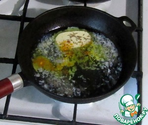 На сковороде растопим сливочное масло, добавим тмин, куркуму и перец красный жгучий.