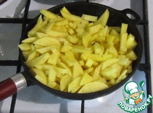 Добавим в сковороду порезанную картошку, хорошо перемешаем. Будем жарить на сильном огне 10 минут, помешивая.