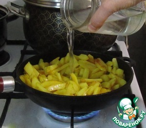 Теперь нальем воду в картошку, доведем до кипения, убавим огонь и будем томить 15 минут под крышкой.