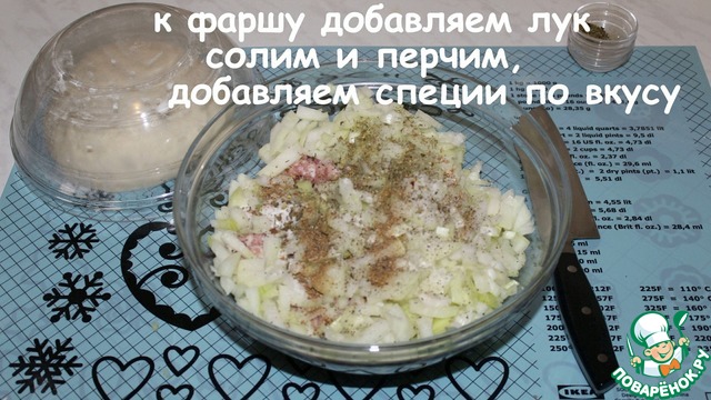 • К фаршу добавляем лук. Солим и перчим. Добавляем специи по вкусу.