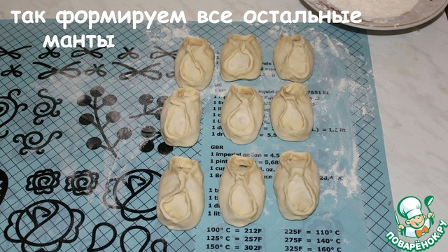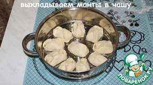 Манты будут сочнее, если лука взять по объему столько же, сколько взято фарша.