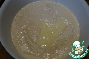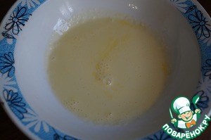 Приготовим тесто. В теплом молоке растворим 1 ч. л. сахара и дрожжи, накроем емкость и оставим на некоторое время, чтобы дрожжи начали работать.