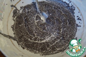 Яичный белок хорошо собьем с сахаром. С мака сольем воду, разотрем его пестиком и добавим белок с сахаром. Добавлять белок будем частями, чтобы было удобно следить за её консистенцией. Начинка должна быть густой, чтобы не потекла при выпечке. Лучше лишний белок убрать.