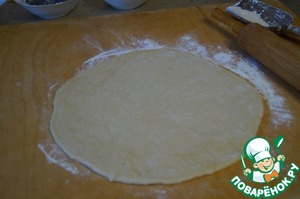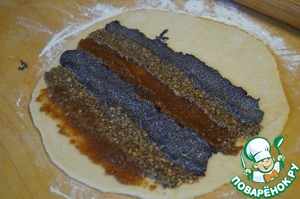 По очереди, полосками начнем выкладывать начинки, отступив при этом с одного края немного, и чуть больше оставим теста с другого края.