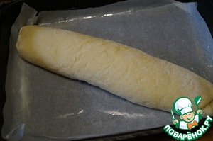 Сформируем рулет начиная его заварачивать с той стороны где начинка ближе. Выложим его на противень застеленный промасленным пергаментом. Оставим рулет минут на 20 для подъема. Перед выпечкой смажем рулет яйцом.