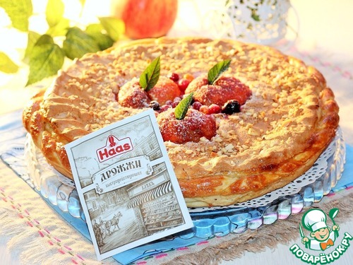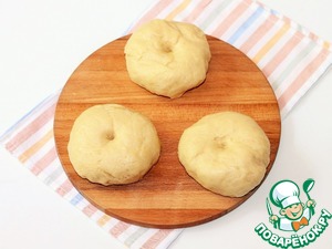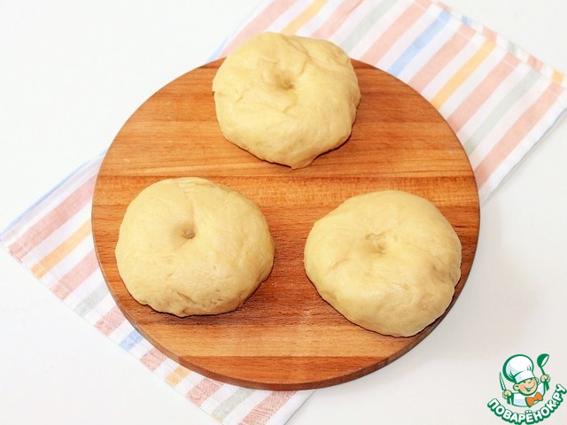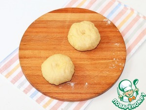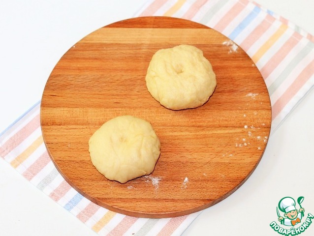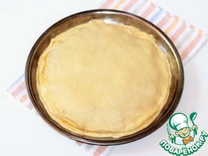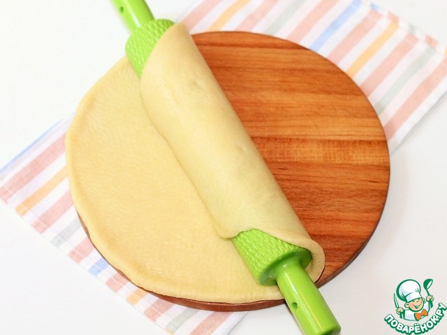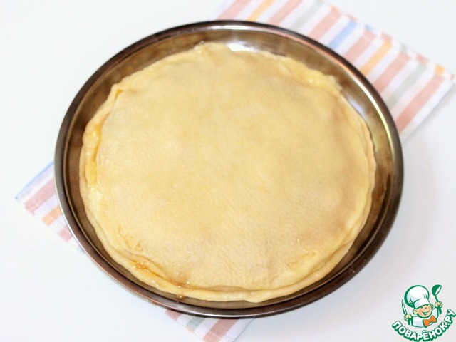 14. Одну часть теста раскатываем в круг и закрываем начинку. Край круга смазываем взбитым желтком.