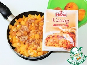 7. Остальные персики нарезаем небольшими кубиками и кладем в расплавленный сахар, перемешиваем и тушим 1-2 минуты. Добавляем крахмал и тушим 1-2 минуты до испарения жидкости и небольшого загустения.