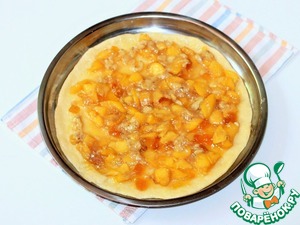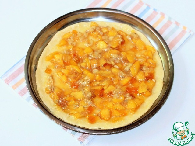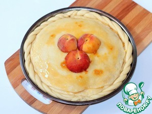17. Переносим "жгуты" на край пирога. Пирог немного смазываем джемом. Берем отложенные половинки персиков, макаем донышком в крахмал и украшаем пирог.