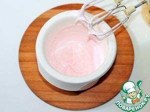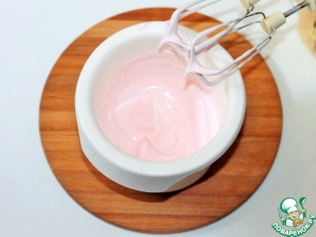 18. Взбиваем 2 охлажденных белка с маленькой щепоткой соли до мягких пиков. Затем не переставая взбивать, добавляем частями сахарную пудру, и взбиваем до твердых пиков. В конце можно добавить 1 ч. л. красного джема.