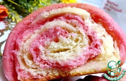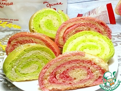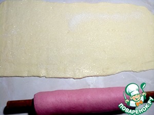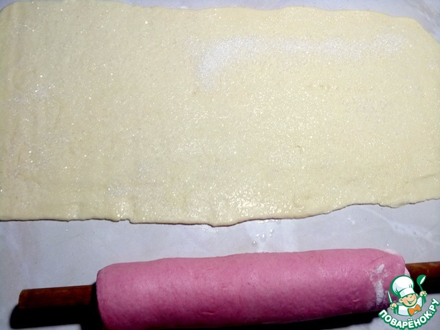 Делим светлое тесто на две части и раскатываем в прямоугольник 05см толщиной примерно 20 х 50. Смазать его маслом без запаха и посыпать сахаром смешанным с ванильным сахаром. Так же раскатываем цветное тесто, наматываем его на скалку и переносим на светлое тесто, подравниваем.