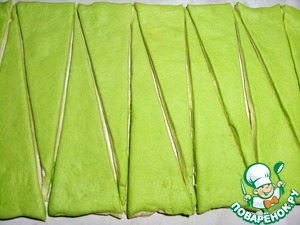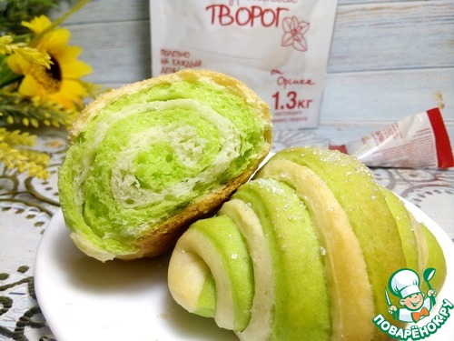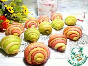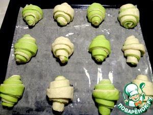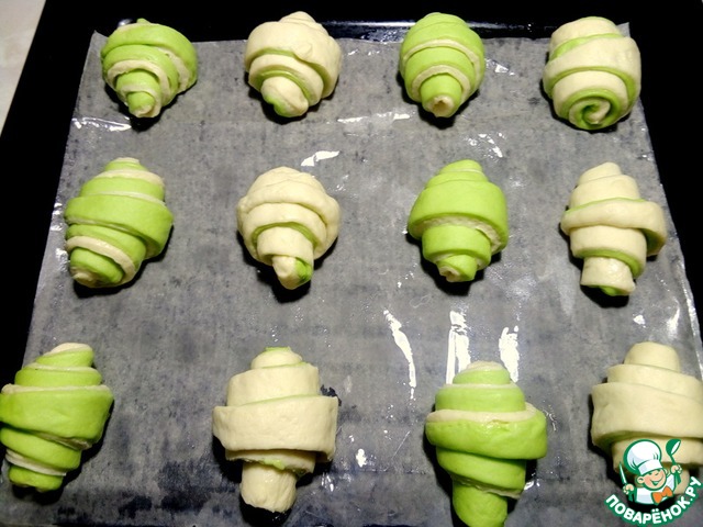 Так же проделываем и со второй частью светлого теста и теста другого цвета. И пока выпекается первая партия, подготовить вторую, скатать в рулетики и дать подойти на столе. Затем перенести на противень.
