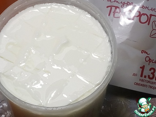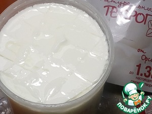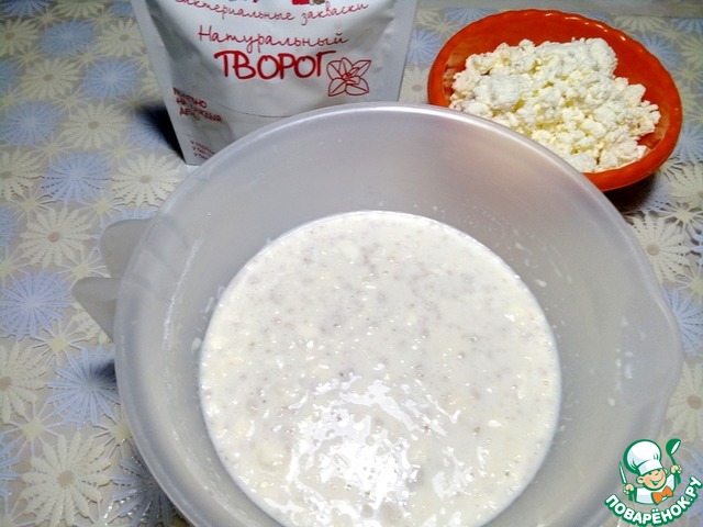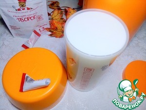 Для начала нужно приготовить творог на закваске от Orsik. Налить теплое молоко в стакан от йогуртницы-термос, добавить закваску творог Orsik, хорошо перемешать.
