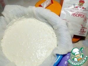 Поставить стакан на водяную баню, подогреть до 50-60°C до отделения сыворотки. Откинуть на дуршлаг застеленный в 4 слоя марли, дать отойти сыворотке. Из 1л домашнего молока получилось 250г вкуснейшего, нежного творога из закваски Orsik.