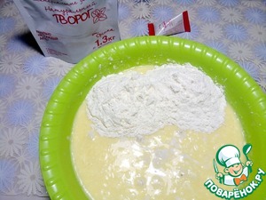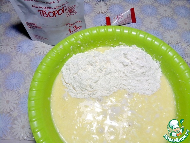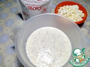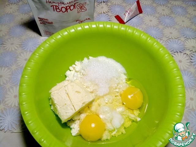 В другой миске смешать творог, оставшийся сахар, ванильный сахар, яйца, мягкое сливочное масло, соду.