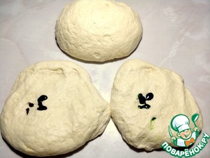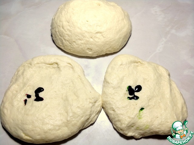 Готовое тесто разделить пополам, а также одну часть из них, еще пополам. В две меньшие части добавить пищевой краситель любого цвета. Я выбрала зеленый и розовый. Одеть резиновую перчатку и очень тщательно вмешать краситель в тесто, подсыпая по необходимости совсем чуть -чуть муки. Так же подмесить и светлое тесто, чтоб было одинаковой структуры, т. к. пока месили цветное тесто, светлое поднялось, стало пушистое.