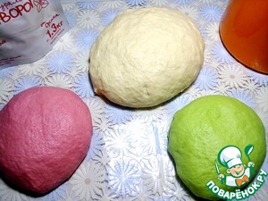 Таким образом получилось разноцветное тесто, готовое к работе. Цвета можно заменить на натуральные, сок свеклы отварной, припущенный на сковороде шпинат, пробитый в пюре блендером, с добавлением ложки молока.