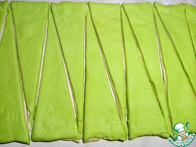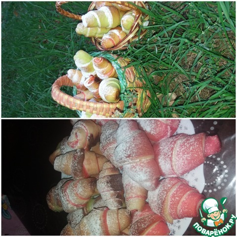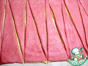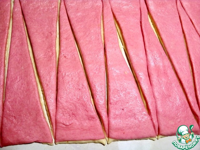 Скатать плоски нарезанного теста в рогалики, начиная с широкой части и укладываем на противень с промасленной бумагой. Дайте подойти минут 15. Стороны нарезанного теста менять, чтоб получились разные по цвету. Сверху белое, внутри цветное и наоборот. Можно смазать молоком и посыпать сверху сахаром. Поставить в горячую духову 180°C на 20-25 минут. Следите, ориентируясь на свою духовку