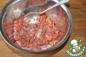 Режем филе на очень мелкие кусочки. Я также порезала туда и молоки. Кстати, моя мама готовила рубленные котлеты из молок красной рыбы или минтая, было очень дёшево и вкусно.