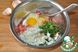Кладём: яйцо, измельчённые лук, чеснок, укроп. Добавляем соль, свеже-молотую смесь перцев, перемешиваем.