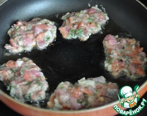 На горячую сковороду наливаем растительное масло, кладём по полной столовой ложке фарша, жарим котлеты с обеих сторон до румяности на среднем огне при закрытой крышке приблизительно по 7 минут с каждой стороны.