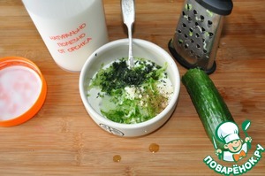 В миску наливаем йогурт, добавляем тёртые свежий огурец и чеснок, сок лимона, оливковое масло, соль, смесь перцев, рубленный укроп.