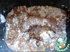В ведро хлебопечки загрузить дрожжи, муку, какао, соль, сахар, пажитник, растительное масло и холодную воду.