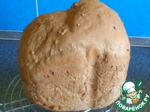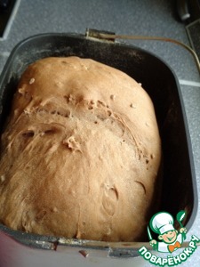 Устанавить ведро в корпус хлебопечки. Замес теста можно сделать вручную и выпекать в духовке, как только тесто увеличится в объеме после расстойки. Выбрать программу хлебопечки. У меня номер один "Основной" и размер хлеба М, программа рассчитана на 4 часа. По окончании программы хлеб достать из хлебопечки. Он замечательно выходился и прекрасно увеличился в объеме.