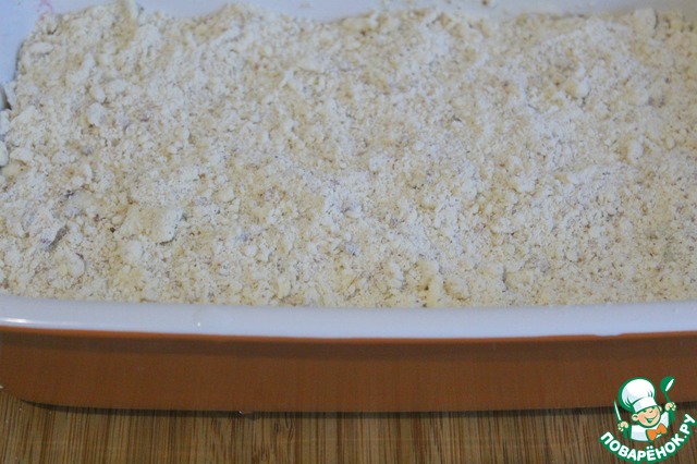 Сверху засыпать штрейзелем и поставить в разогретую до 200 градусов духовку на 30 минут.