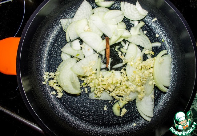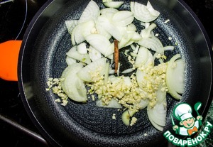 В сковороду наливаем растительное масло и выкладываем лук с чесноком и половину палочки корицы. Пассеруем до зарумянивания овощей.