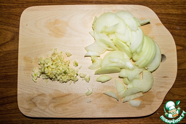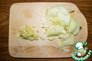 Лук и чеснок почистить. Лук нарезать полукольцами, чеснок мелко порубить.