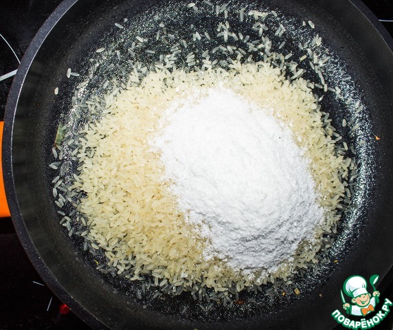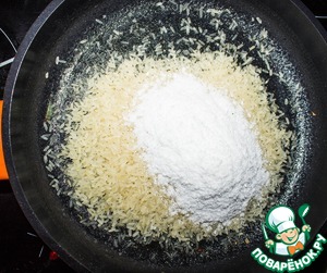 На эту же сковороду наливаем еще 3-4 ст. ложки масла и высыпаем рис с кокосовой стружкой. Обжариваем до золотистого цвета. -