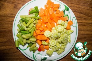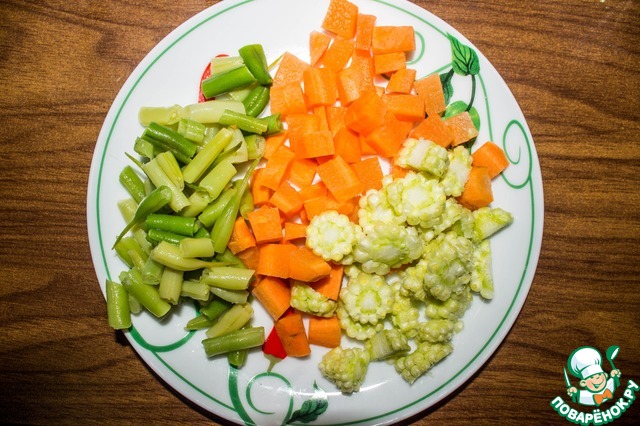 Морковь почистить и нарезать кубиками небольшими. Фасоль тоже режем некрупно. Кукурузу я использовала молодую совершенно, поэтому порезала просто початки. Если кукуруза спелая, снимаем аккуратно зерна с початка при помощи ножа.