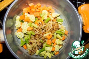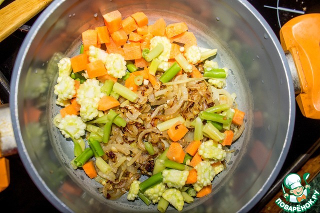 Добавляем овощи в сотейник к луку с чесноком и тушим 5-7 минут.